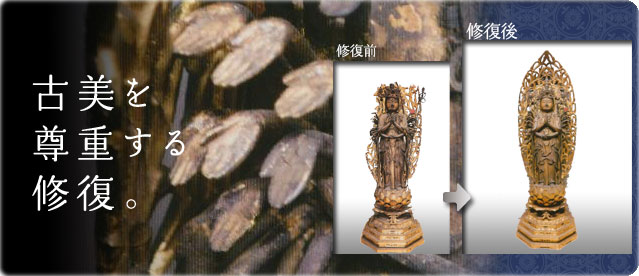 漆箔を施した後、古色彩色により、永年、礼拝されてきた御仏像の古美を尊重した修復です。